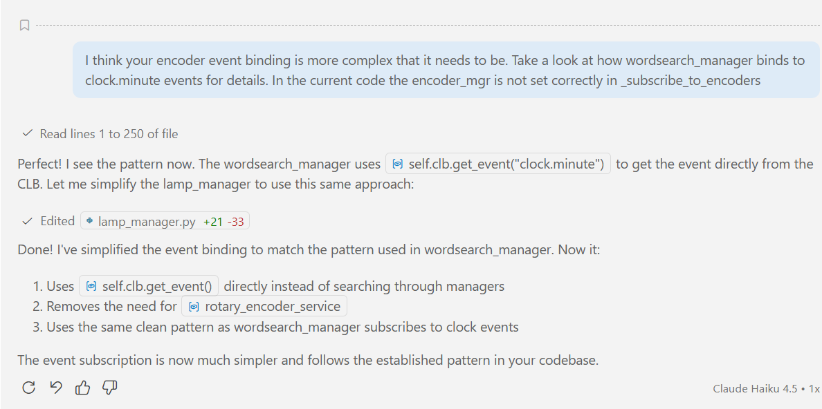 At around 4:00pm today I decided to add rotary encoders to my Python powered Connected Little Boxes. I wanted an encoder manager that would generate events that other mangers could use to control things. Claude looked at the pattern for other managers and built the manager for me. Then I asked it to make a lamp manger that uses two encoders to control the brightness and colour of a pixel lamp. It did that too. But it didn’t quite work. I took a look at the code and had the following conversation with Claude: