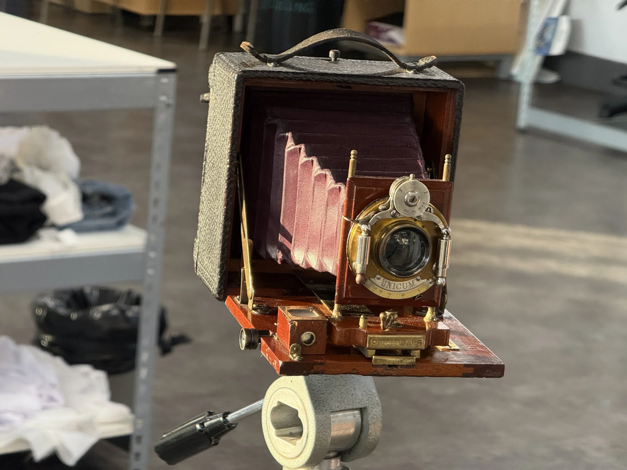 But we did manage to get some good pictures though, along with some glorious failures. I was very concerned about focus. So I adjusted the bellows on the camera until I had a subject in focus at a particular distance. Then I cut a piece of string to that length. Now, to get a sharp picture I just had to put the bellows at my known position and then use the length of the string to set the distance of the subject from the camera. Worked for me, and the subjects. I did manage to lose a few shots. A couple were under exposed and two more went through the processor the wrong way. But I was able to hand out a few nicely sharp and well rendered prints, which was nice.
