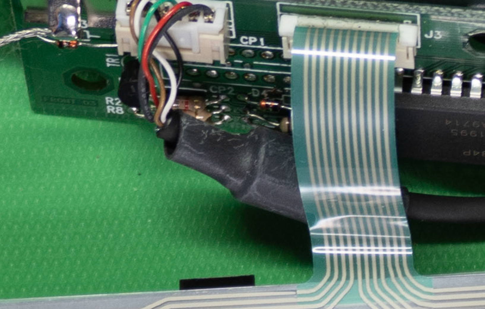 A smoking gun if ever I saw one. You can see the gap in the top track of the membrane at the bottom of the picture. I thought the green covering the ribbon cable was another layer of tape stuck onto the back of the keyboard membrane, but actually it is a layer of paint. So I scraped it off around the break and then clarted the whole thing in conductive paint. And it fixed the problem. The hardest part was getting the keyboard mechanism back in the case. That took two goes.